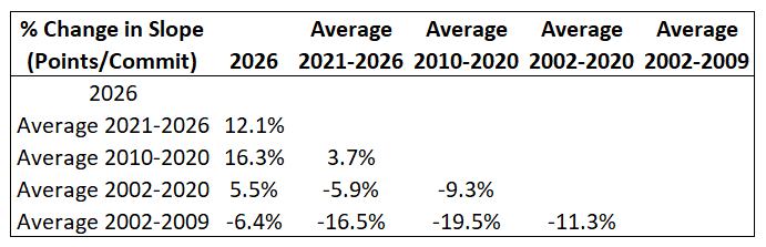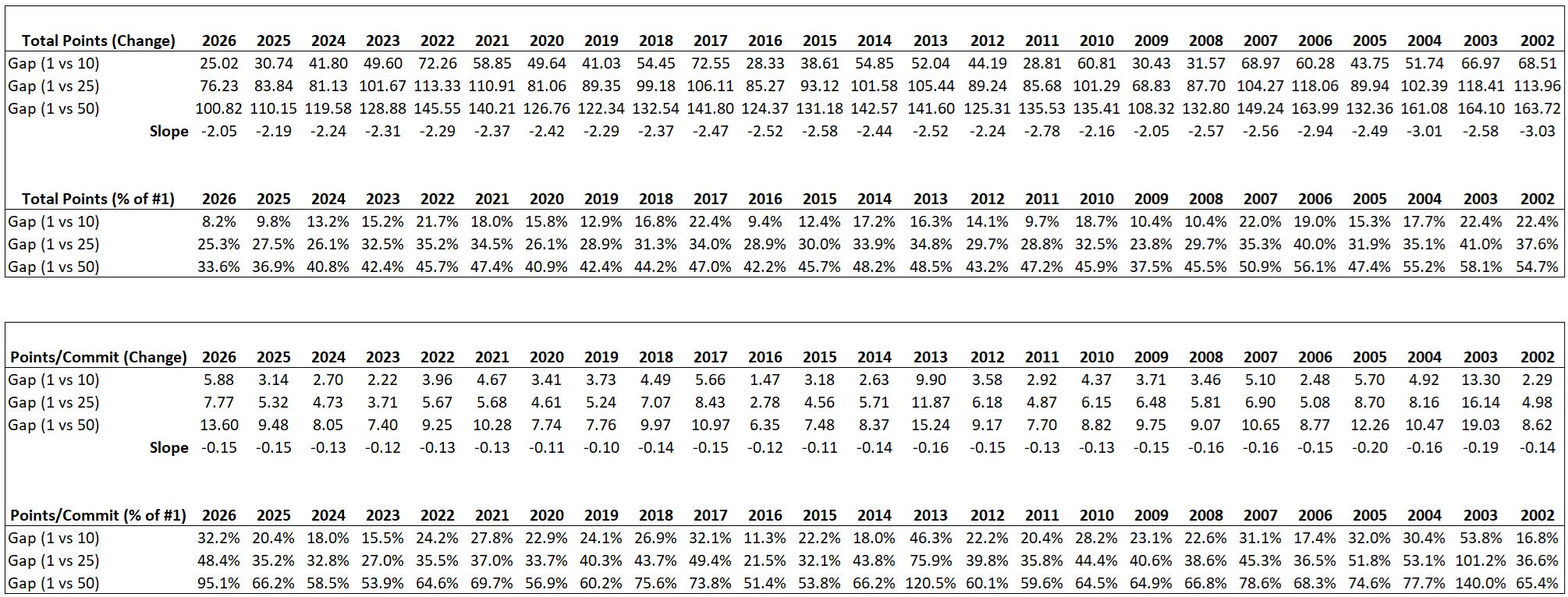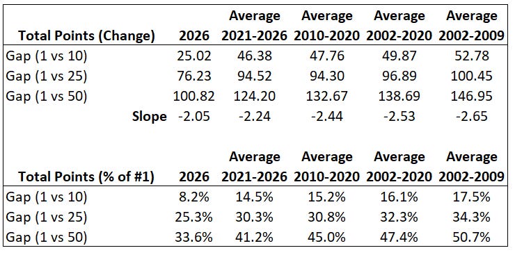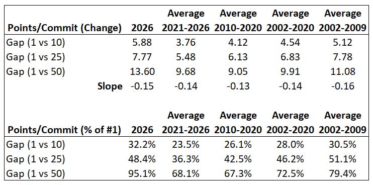 Again we see the same indications of much more competitiveness in the most recent era. In fact the curves rise significantly in the middle and stay higher down to the #50 team. It appears 2026 might be aberrational since it stands out as compared to the 2021-2026 grouping for which it is a part.