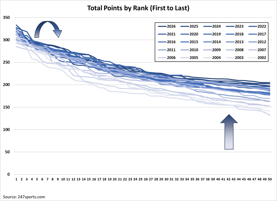 247 scores each team’s recruiting class giving it a point value. For 2026 the #1 class is USC with a score of 305.47 while the #50 class is Kansas State with 203.62—a gap of 101.85. In 2015, to pick a random year, the gap between #1 Alabama and #50 Virginia was 131.18. Anecdotally, this shows more competitiveness in 2026 than in 2015. The same is true when looking at 2002 where the gap was 163.72 between #1 Texas and #50 West Virginia. (See the postscript at the bottom for the inspiration of looking deeper at this).