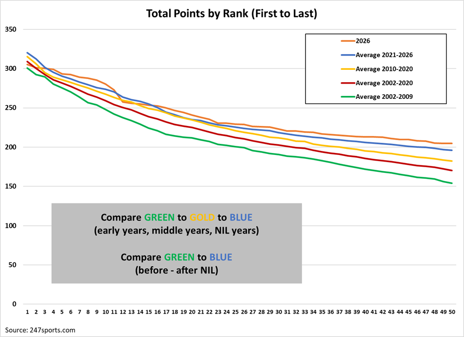 The transfer portal as well as changes to the signing rules could be distorting total points. It is for this reason that I wanted to look at the full curve rather than just he gap between #1 and #50. Still, we should consider the points per recruit (commit) to control for this.