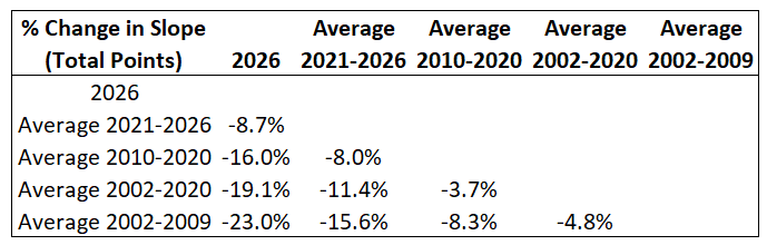 Here is a graphical look at the rankings for 2026 and the average for groups of years. Notice that the lines are flattening significantly.