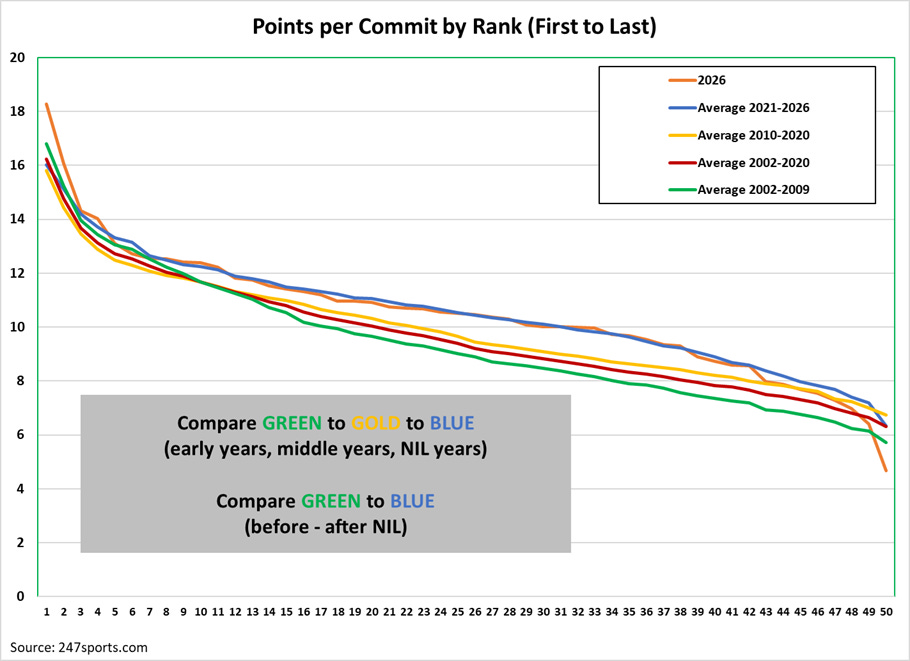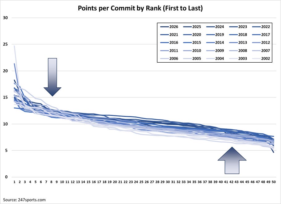 All the gain is at the bottom with actually some improvement at the top. This might indicate that the gains to the bottom teams are coming from better acquisitions at the expense of teams further down the rankings. See the note at the bottom about expanding the analysis as well as the caveats. Another thing to consider is if the data is consistent throughout the period examined (2002-2026). I believe it is based on my understanding of 247’s recruiting methodology, but this remains an area to examine.