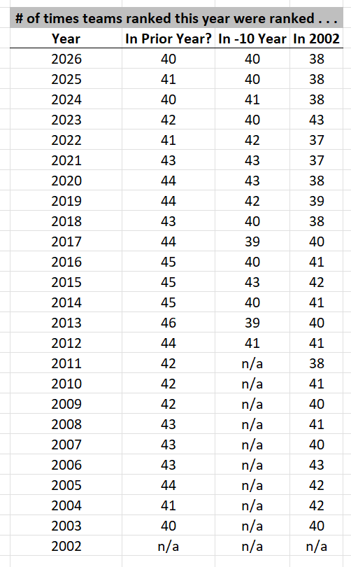 One way to examine the flattening is to look for persistence—how much year-over-year turnover is there in the list. For this I looked at the number of new teams from the prior year, from a year 10 years prior (for each year 2026-2013), and comparing each year versus 2002.