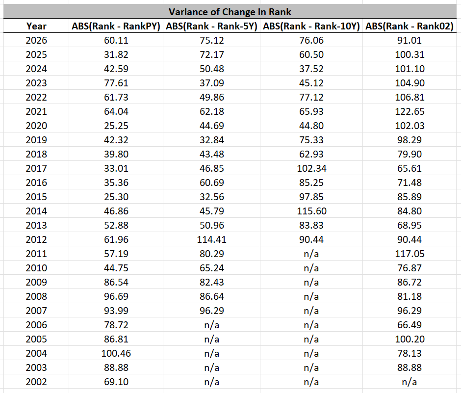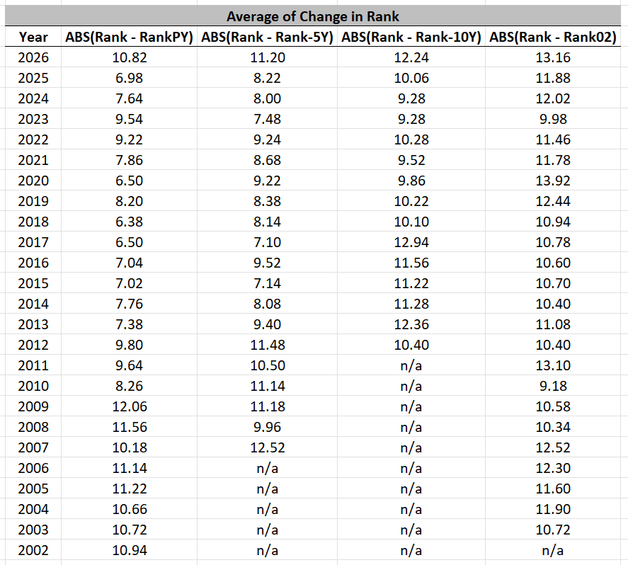 Additionally I looked at the change in team rank. To do so I considered both the variance in change of rank and the average change in rank looking in both cases for each year to the prior year, 5 years back, 10 years back, and since 2002 periods. In both cases the story is mixed as for the most part turnover in where teams are ranked bottomed out (became the least competitive) in the middle of the dataset (~2015 through ~2020) with the recent period being a movement back to the highest levels of turnover (more competitive today than in the middle of the last 20 years).