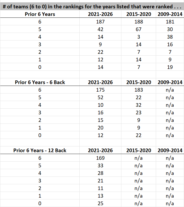 Reading the results in the first grid shows that 187 times 6 teams in the 2021-2026 were in the rankings each year of 2021-2026 and in the rankings 2015-2020. Basically no change from the cohort 2015-2020 (looking back to 2009-2014 for them). But there were 14 teams in the 2021-2026 rankings that were not at all in the 2015-2020 rankings while it was only 7 teams in 2015-2020 that were “new” compared to 2009-2014.
