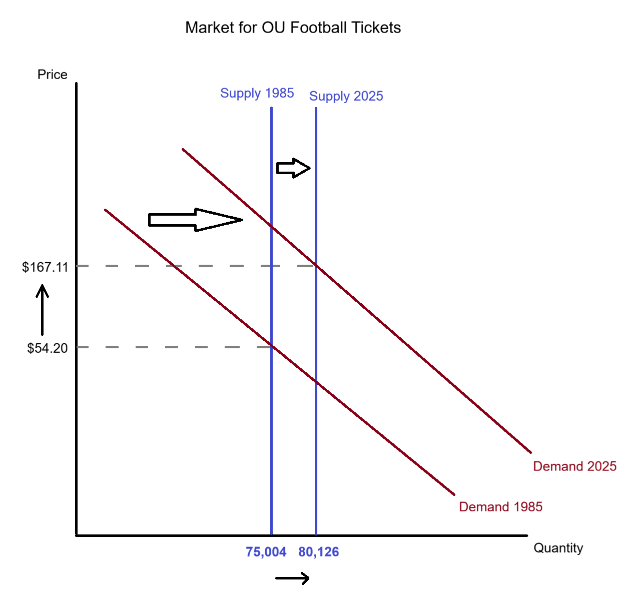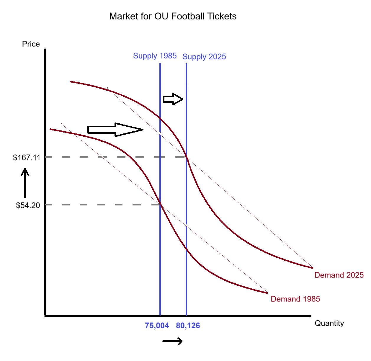 Here is a stylized example of the market for OU football home game attendance over the past 40 years.