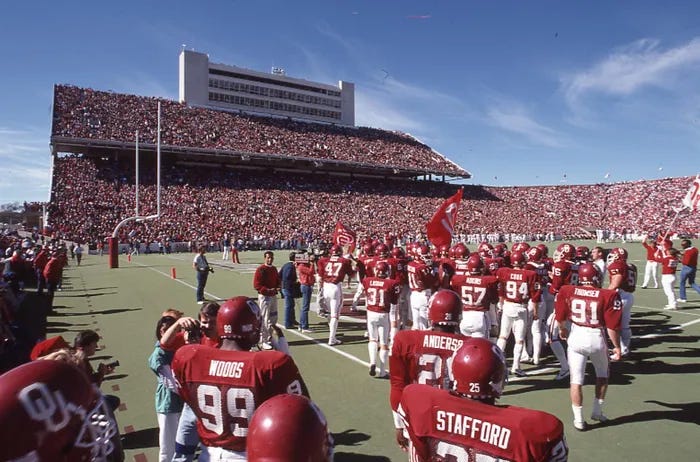 I say “seem” because our memories can deceive us. In this post I am going to focus on the University of Oklahoma’s football stadium. I think it serves as a good proxy for stadiums and arenas of a similar nature in both football and other major sports. That nature is large-scale venues for highly popular teams with long histories of success.