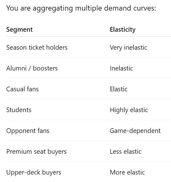 From an economics standpoint, the supplier (universities) should be seeking profit maximization. And it is true that in a simplistic sense given what I’ve laid out (inelastic demand and near monopoly power) the profit-maximizing size of stadiums would be relatively smaller than if one or both of those conditions were different (elastic demand or competitor power). However, there is more to the story than that.