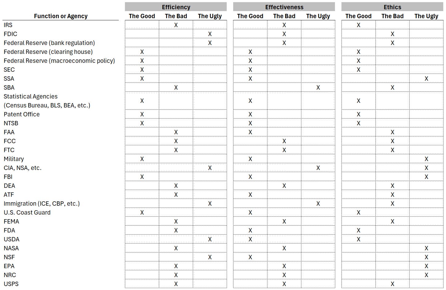 This is not intended as a definitive analysis. As such, it is a fluid list—sometimes these functions or agencies will be in one category, and then sometimes an entirely different one. The military is a great case in point when it comes to ethics. We don’t have to support a particular war or even the troops always and equally under any circumstances. When it comes to efficiency, the FDIC is really good at closing banks but really bad at preventing the need to close banks.2 In other words there is good and bad (and ugly) execution as well as good and bad (and ugly) endeavors.