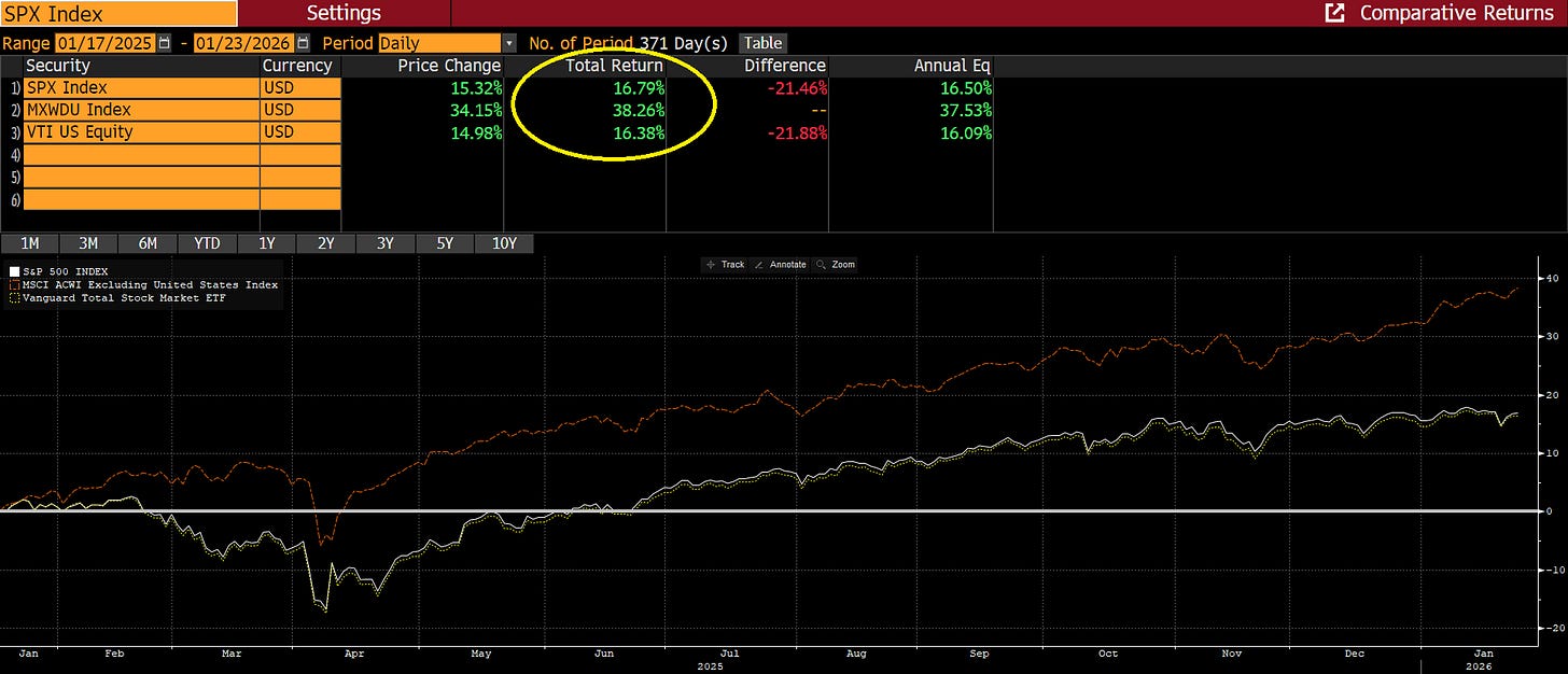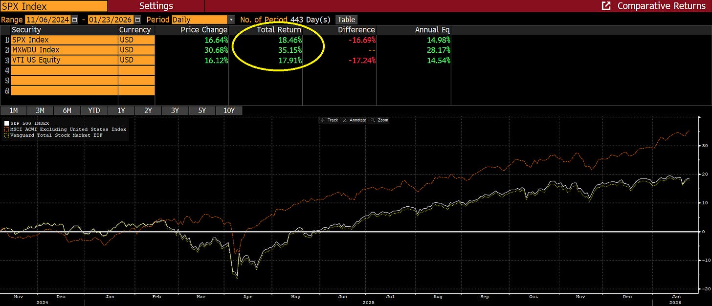 Ironically he probably does deserve some credit for the international returns since they are driven in large part by the decline in the value of the dollar.