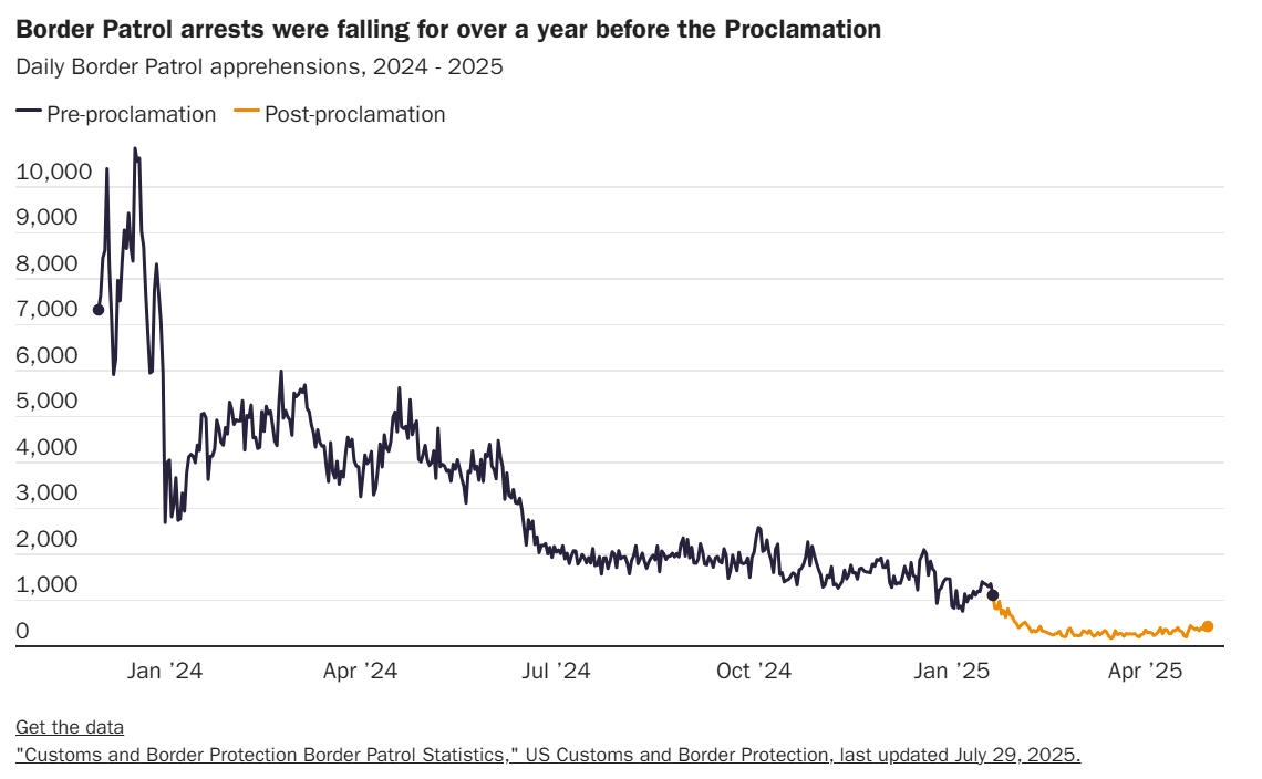 One thing to consider with regard to the first aspect is if Trump’s actions brought about calm to the chaotic southern border. There was an effect, but border arrests were falling well before he took office.