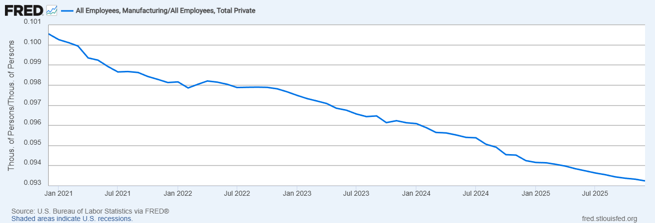 Number and percentage of manufacturing jobs in the U.S. - loss. Trump’s term has been an acceleration of the decline in manufacturing jobs in total and a continuation of decline as a percentage of total jobs.
