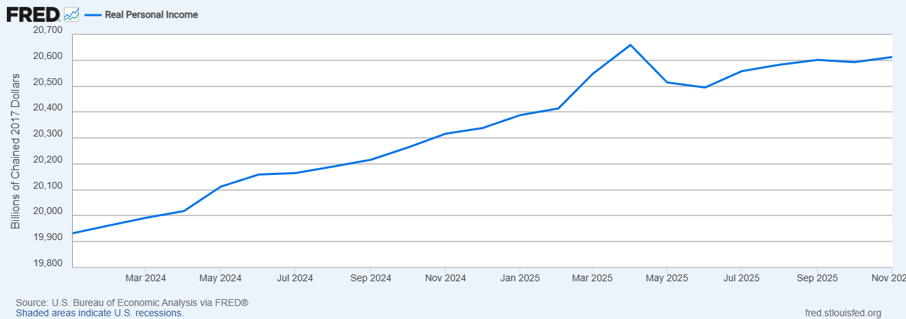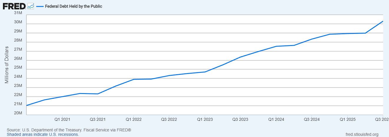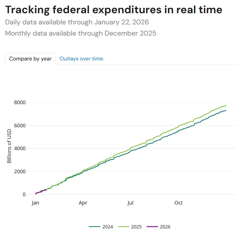 Federal government spending - loss. Despite what they told you about DOGE, spending just keeps on truckin’. The total for calendar year 2025 was $7.765 trillion. That is a 5.8% increase in spending over 2024’s $7.34 trillion.