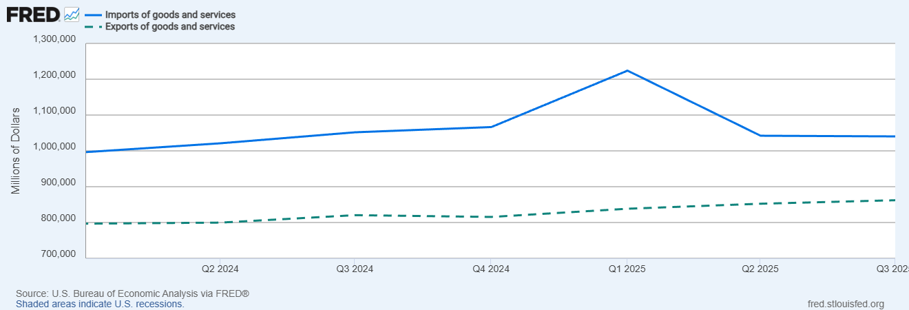 Trade balance - win? You and I know this doesn’t mean anything in and of itself, but the administration certainly thinks it does. More importantly this metric “improved” by imports falling (second chart). In other words the benefit of trade (imports) went down while the cost of trade (exports) stayed about the same. It’s a win in his mind and his mind alone.