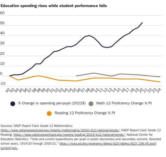 “The [chart below] depicts changes in the share of twelfth-grade students hitting “proficient” from the baseline years of 1992 for reading and 2005 for math. It also shows the percentage change in inflation-adjusted spending per pupil from the 1992 baseline. The results are not good: real spending rose more than 50 percent, while the share of students proficient in reading dropped 6 percentage points—from 40 percent in 1992 to only 34 percent in 2024—and in math fell 1 percentage point, from 23 percent in 2005 to 22 percent in 2024.”