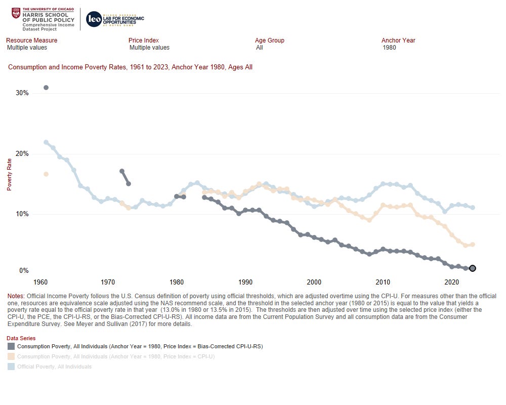 Another source, PovertyMeasurement.org, finds the figure of consumption poverty is about 1.1%. This was part of a great post in The Free Press by Cliff Asness and Michael Strain. I believe the differences between the two lies in the inflation adjustment. Regardless, this is great and perhaps surprising news. I share the chart of this progress below.