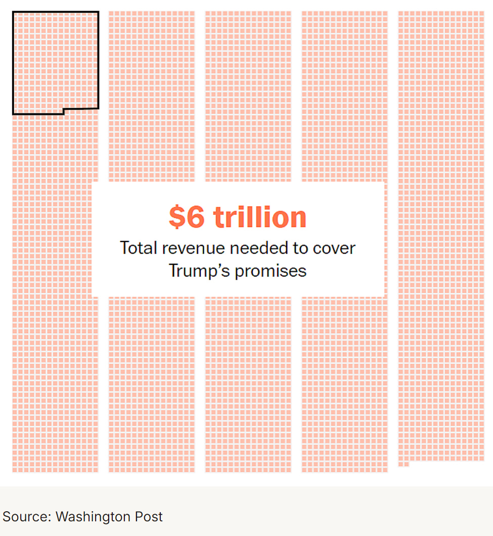That is the opening paragraph from the Washington Post editorial board where they compare Trump’s promises of what his tariffs will pay for and how much they were estimated to bring in. The graph is from the piece as well. The boxed region is the amount the Trump administration estimates that tariffs will would have brought in.