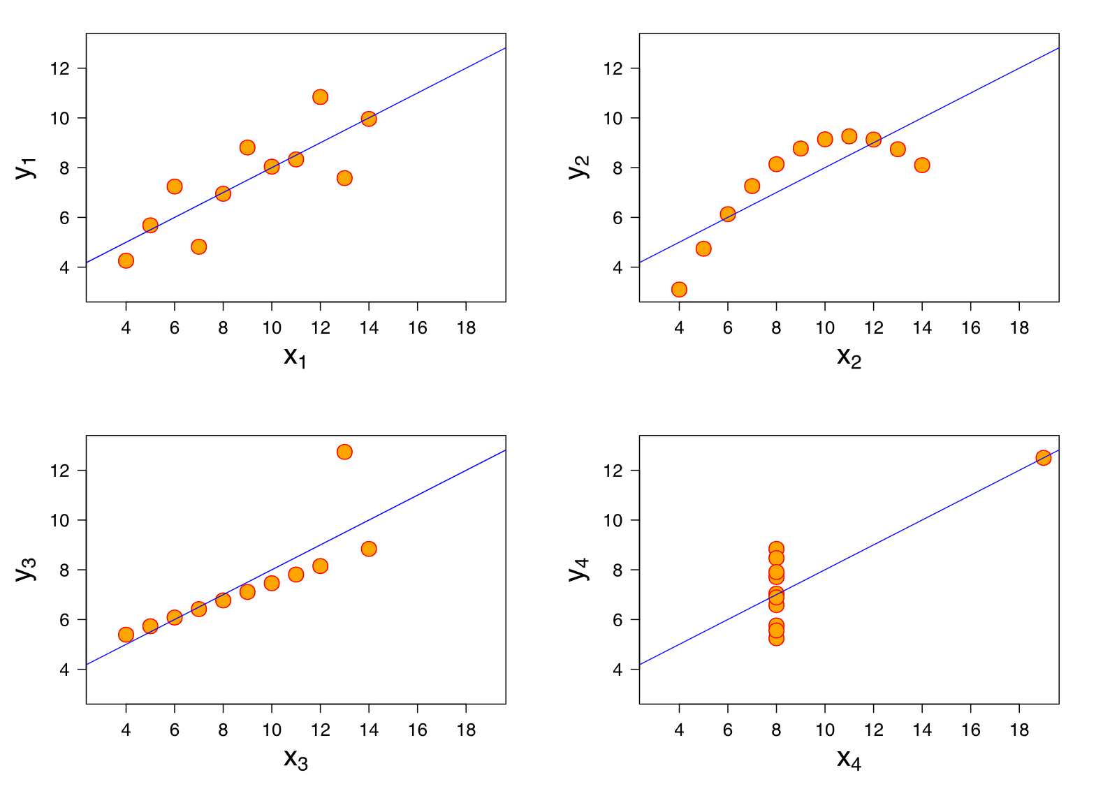 Anscombe’s quartet is an example as shown in the picture below where four very different datasets all have the same mean, variance, correlation, and linear regression. See for yourself if you would have predicted this just looking at the graphs.