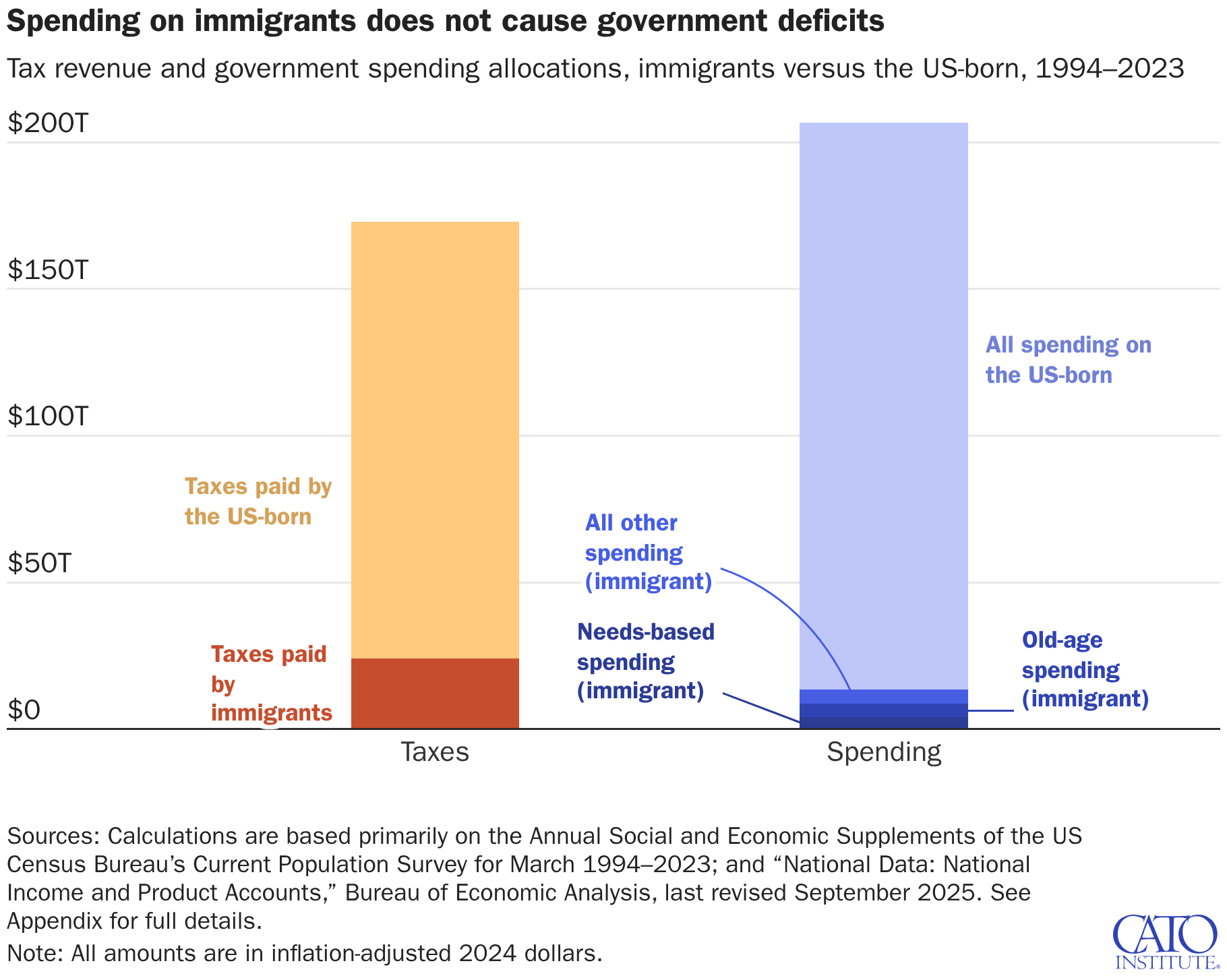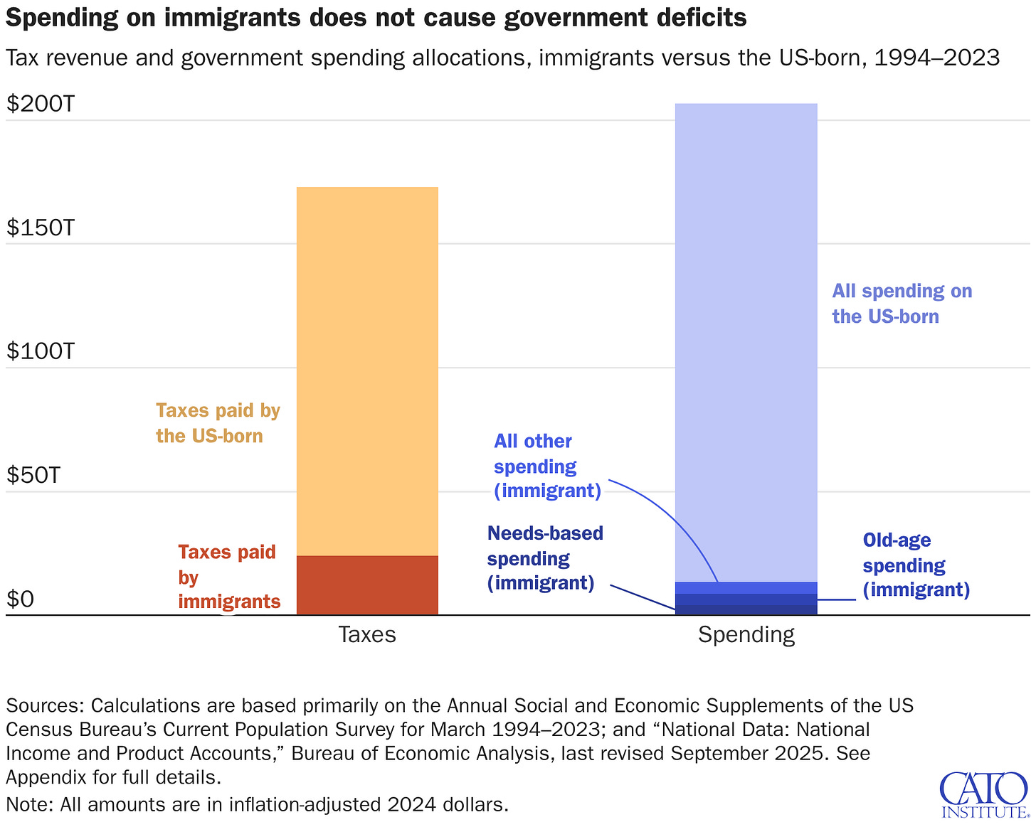The quote above and excerpts below come from the Cato Institute’s latest study “Immigrants’ Recent Effects on Government Budgets: 1994–2023”. It contains a wealth of analysis many will find surprising as well as quite counter to conventional wisdom. And the gravity of it is of a massive magnitude—hitting triple themes here at MM.