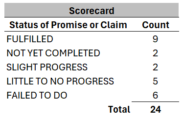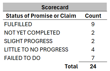 First some commentary. This was always a partial list. More importantly it was always an unweighted list. Some of the promises were very significant while others much less so. None were unmeaningful; although, quite a few were crazy on stilts—all too typical of Trump.
