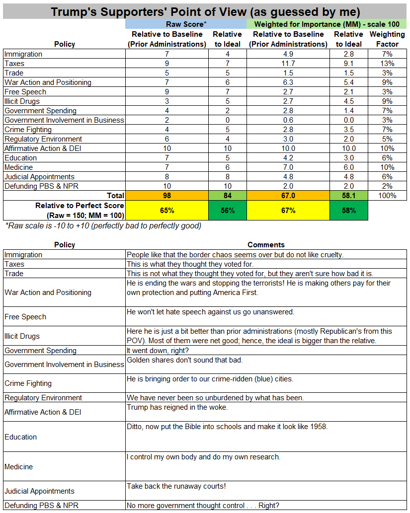 Next is Trump supporters’ generalized point of view. Keep something in mind as I risk committing the fallacy of the illusion of asymmetric insight (claiming to know more about others including their motives than they know themselves). My estimation of magnitude, the weighting factor, for supporters is an attempt to reflect the reality rather than the misperception of impact/value. In other words, you can think all you want that defunding NPR was the most momentous policy since the Magna Carta. You’re just by yourself in LaLa Land in doing so. These weighting factors attempt to reflect supporters’ preferences but not their misinformed biases.