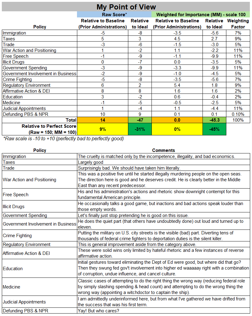 Analyzing my scoring one finds that while being far from perfect in the raw score (14 and -47 or 9% and -31% when looked at as a percentage of perfect—out of 150), Trump is meaningfully worse adjusted for magnitude (going to 0.0 and -45.3 or 0% and -45% as a percentage of perfect—out of 100 in that case). One interesting observation is that relative to baseline I have Trump as a net positive/flat performer (the 14 and 0.0 figures). This corresponds to my attempt a year ago to score the two candidates. Realize, less bad is still bad. And two categories, AA/DEI & PBS/NPR, are doing almost all of the work here. Taxes and regulation are positives. The rest are flat or negative. Reigning in DEI and defunding state broadcasting are big wins, yet . . . say it with me . . . magnitude matters.