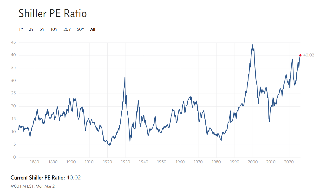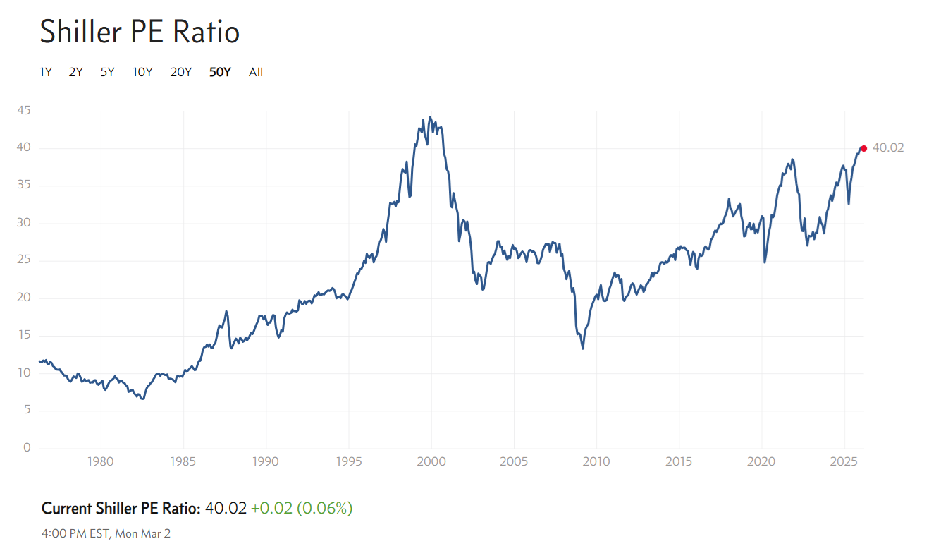 Another way to view the valuation history of CAPE is to chart it directly as done here from Multpl.com (all-time history followed by just the last 50 years):