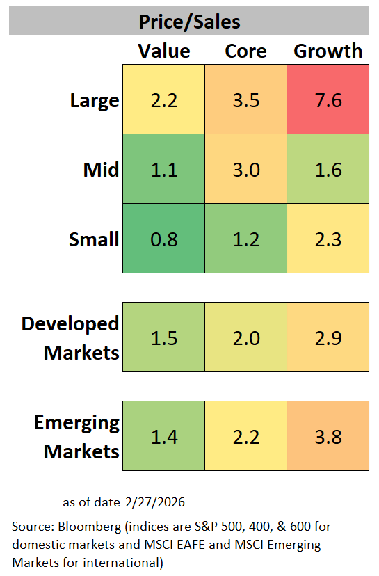Let’s focus on all large U.S. stocks (growth and value) using the more familiar S&P 500 Index. For it we can calculate the same P/S ratio.