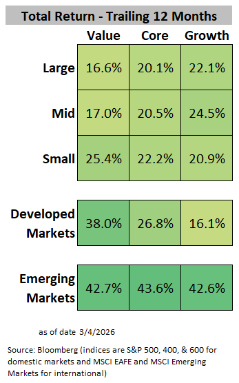 The past year has been very kind to this allocation. Here are the 12-month returns through March 4, 2026 overlaid in the same style-boxes: